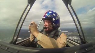 Fotograf Jack Drain ztrácí svůj telefon během letu v letadle druhé světové války přes Jacksonville na Floridě. Smutek je namalovaný na obličeji.