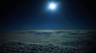 Z kokpitu letadla, pilot natočený nočního letu nad mraky na Arabském poloostrově. Mraky jsou osvětlena měsíčním světle, dimiourgnotas krásným obraz.