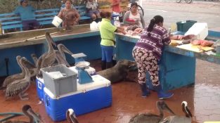 V populární trhu s masem v Galapágy Ekvádoru, hejno pelikánů a těsnění čeká za prodavačů u některých kousků masa.