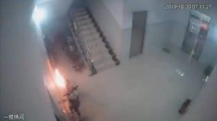 U vchodu do činžovního domu v Číně, baterie elektrického skútru jako náboje exploduje. Zde několik výbuchů a prostor zaplní kouřem.