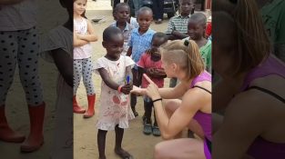 Sportovec navštěvuje děti v Africe, a dává velký úsměv na dítě. Dává to držet pero v ruce, Potom točí fotbalový míč a zůstatky na [...]