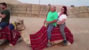 Dva turisté snažit velbloudí jízda. Bonus romantický soundtrack.