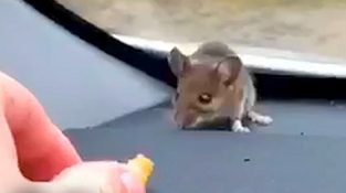 Muž našel myš v autě a snaží se ji vytáhněte. On testuje různé metody k nalákání, ale myš se zdá nyní teplo do auta.