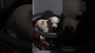 Štěně je ukryta v koši prádla, ale jeho ocas odhalí úkryt.