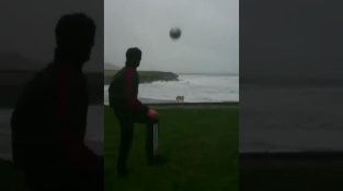 Muž kopne míč silou proti větru, a ona se vrací ke stejnému bodu.