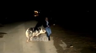 Velké prase začali pronásledovat novináře George Papadakis během živého vysílání v oblasti Kineta.