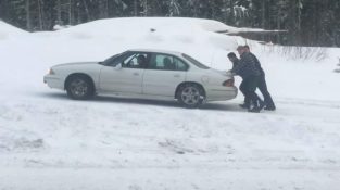Skupina čtyř mladých tlačit auto na zasněžené silnici, a mají dát sněhové řetězy na kola zadní nápravy vozu emprosthiokinitou.
