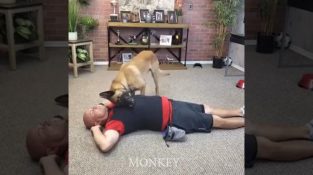 I když samozřejmě nechápe, co dělá, pes byl vyškolen tak, aby napodoboval všechny potřebné pohyby během kardiopulmonální resuscitace.