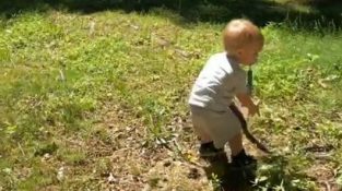 Malý chlapec chytí hada při hraní se svým psem. Viděl plaz v rukou svého syna, otec okamžitě zasáhne, aby chytil hada a zahodil ho.