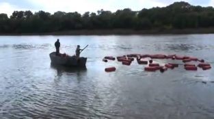 muž hraje ve vodě se psem, auto klesá a lahve s plynem vznášejí