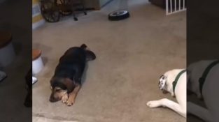 Robotický vysavač zasáhne psí nohu, když spí, a okamžitě se obrátí k obvyklému podezřelému.