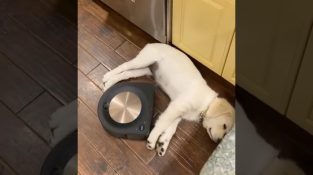 Unavené štěně leží na podlaze v kuchyni, zatímco robotický vysavač se čistí. Koště prochází kolem psa, což zřejmě moc nezáleží.