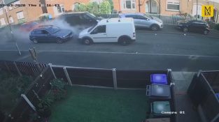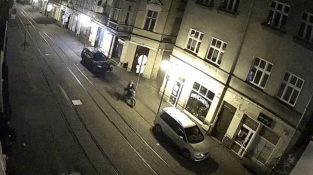 Motocyklista v Polsku vypadá, jako by byl trvale opilý, protože ho kamera zaznamenala a způsobila poškození zaparkovaných aut a obchodu, dva různé dny.