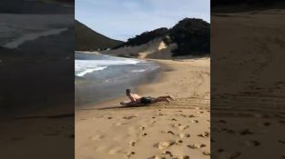 V Hobartu v Austrálii, Theo začíná surfováním z duny, a končí u moře. Zasáhnout vlnu, před přistáním ve vodě udělá velký skok.