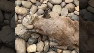 V parku Woodside Wildlife Park v Lincolnshire v Anglii, vydra hraje s kamenem pohybem mezi nohama.