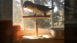Papoušek zobákem pomalu seká okouna, zatímco na něm sedíte.