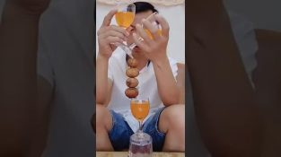 Muž vyvažuje dvě sklenice na čtyřech ořechech, což zase vyvažuje na minci na okraji sklenice.