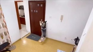 Husky pes otevře dveře a obdrží od distributora jídlo objednané jeho šéfem. Poté, co vzal pytel do úst, hlasitě zavře dveře nohou.