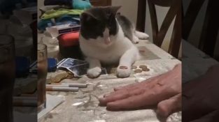 Muž ukazuje své kočce trik s mincí, který to pak opakuje.