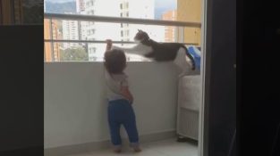Vidět dítě z rodiny, jak se snaží vylézt na zábradlí balkonu, kočka okamžitě odstrčí ruce.