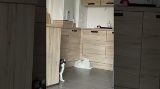 Dvě kočky bojují, a jedna z nich používá svůj dům jako úkryt k útoku z trezoru.