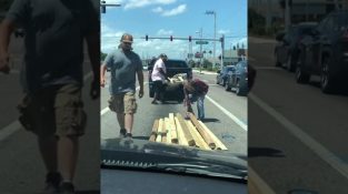 Na Merrittově ostrově na Floridě, Několik protijedoucích řidičů pomáhá starému muži naložit dřevo, které spadlo z jeho kamionu, na silnici.