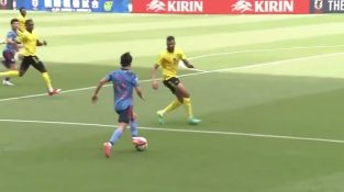 Japonský fotbalista Takefusa Kubo dává neobvyklý gól, jak míč míří pod nohy čtyřem nepřátelským jamajským hráčům.