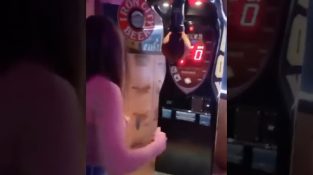 Mladá žena v baru dělá velmi působivé skóre, když udeří do pytle v punčové hře.