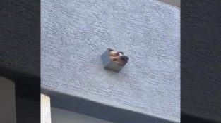 Pes vytáhne hlavu z větracího otvoru, po vůni grilovaného kuřete ze sousedova grilování.