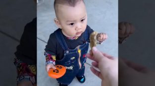 Matka chce nakrmit svého malého syna, když najednou pejsek přijde, aby malého chlapečka popostrčil a pochoutku sám uchopil.