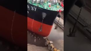 V loděnici v Číně, buldozery tlačí nově postavenou loď do moře a ta se pomalu valí na dlouhých válečcích.