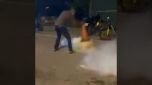 Dva muži chytrou metodou zneškodní nádobku se slzným plynem, pomocí varovného kužele.