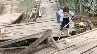 Majitelka člunu v Indonésii nám ukazuje, jak kotví svou loď k molu.