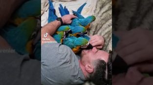 Johan Devenier, majitel 6 papoušků macao z Jižní Afriky, uspává své oblíbené mazlíčky.