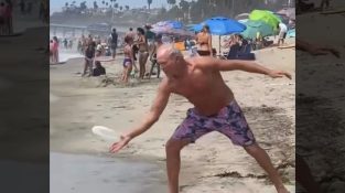 Na pláži, muž nám ukazuje velmi působivé triky s frisbee.