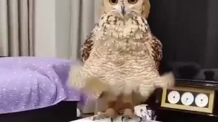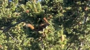 Veverka hází šišky na verandu