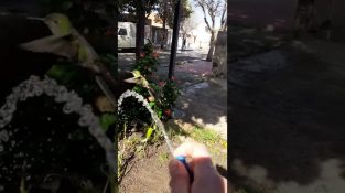 Kolibřík se blíží k vodě vycházející z hadice, vykoupat se.