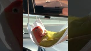 Papoušek leží na lékařské masce, která se promění v houpací síť, když visí ze zrcátka auta.