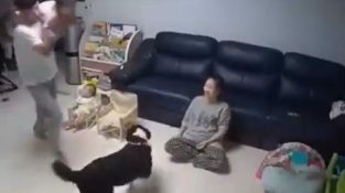 Otec hraje s celou rodinou „letadlo“., vyzvedávání malých dětí postupně, jeho pes a žena ve vzduchu, když běží přes místnost.