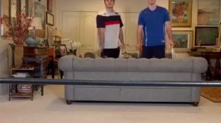 Jak ho jeho přátelé drží za nohy, mladý muž se pokouší chytit míč, který spadl do malého rybníka. Ale udělá špatný pohyb, aby hodil míč zpět…