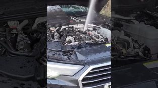 Mechanik demontuje zapalovací svíčky z motoru Audi A6, který byl naplněn vodou, a voda je rotací pístů vymrštěna do vzduchu.