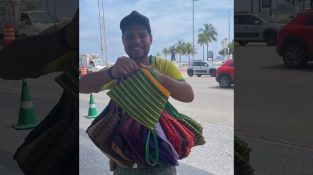 Pouliční prodavač v Brazílii ukazuje tašku skládající se z dlouhého pruhu látky a zipu.
