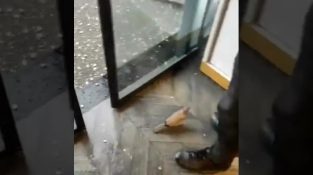 Obchodník v Turecku nechá holuba, aby se uchýlil do svého obchodu, při krupobití.