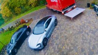 Při otáčení na dvoře domu, přepravní vůz poškrábal elektrické Porsche Taycan svou zvedací plošinou.