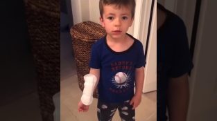 Malý chlapec vysvětluje své matce, že si od sestry půjčil velký „náplast“ na pohmožděnou ruku.