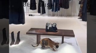 Kočka vnáší svůj osobní dotek do výzdoby výlohy obchodu s oděvy Massimo Dutti ve Francii.