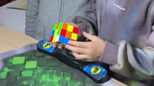 Dvě děti, ο Xuanyi Geng και η Qixian Cao, řeší spolu Rubikovu kostku, každý jednou rukou. K dosažení tohoto výkonu jim trvalo pouhých 9 524 sekund.