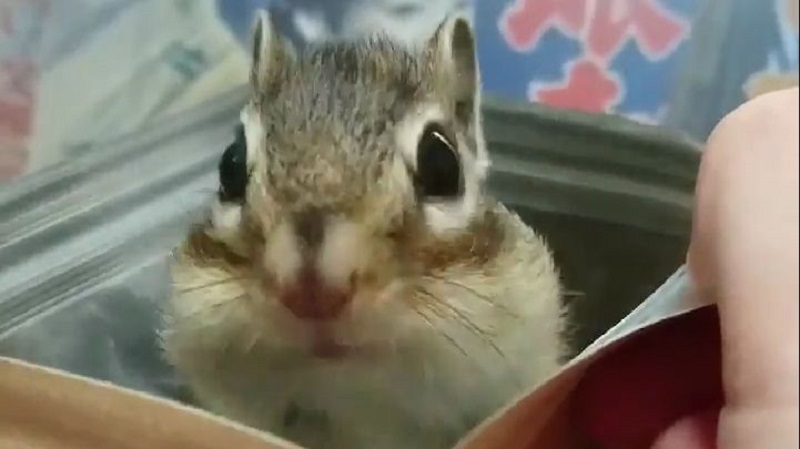 En lille katoikidios egern nyde et solidt måltid i en pose chips.