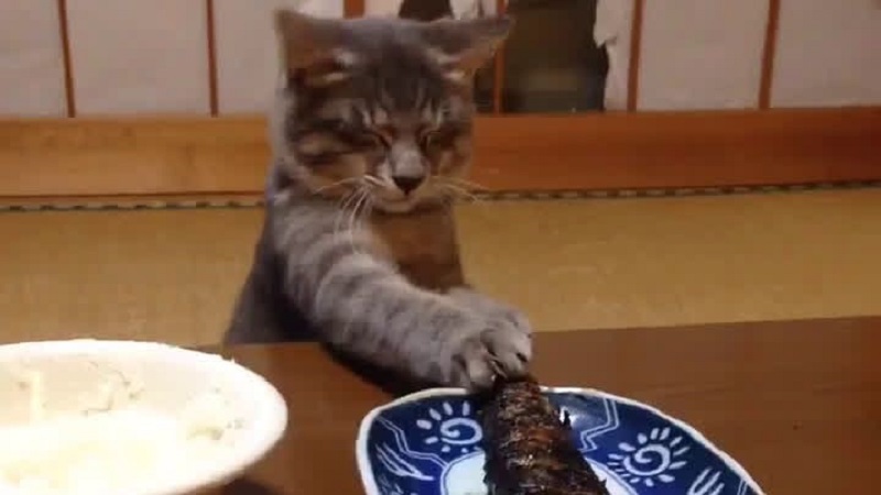 I Japan, en kat forsøger at få fat i en grillet fisk på en tallerken på bordet. Chefen siger nej, men katten insisterer.