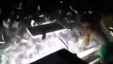 I et fiskerfartøj i Japan, et antal lystfiskere stå på den ene side, mens en anden agn flyver i vand. Brug lokker, fisk meget hurtigt store bugstribet flokke, der kommer til at fodre.